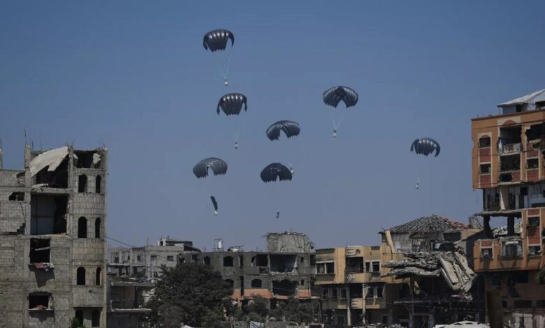İsrail insani yardım koridorlarını açtıktan ve Filistin bölgesindeki çatışmaları kesintiye uğrattıktan sonra Pazar günü Gazze'nin bazı bölgelerine uçakta gıda yardımı başladı.